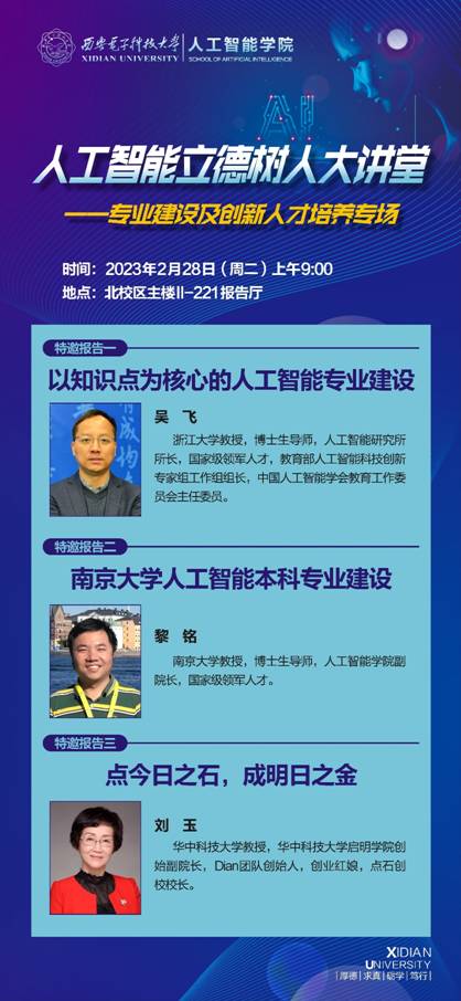 为进一步加强专业建设,落实立德树人根本任务,全面提升人工智能领域专业人才培养质量,pp电子邀请浙江大学吴飞教授、南京大学黎铭教授、华中科技大学刘玉教授,于2023年2月28日(周二)在pp电子官方网站北校区主楼II-221报告厅,围绕人工智能专业建设和创新人才培养为我们带来报告、交流。欢迎广大教师前来聆听交流!