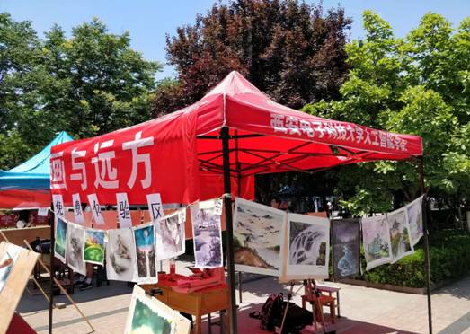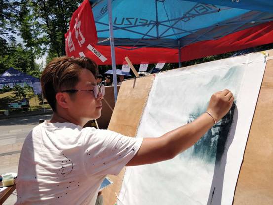 活动现场兼具展示区与体验区。展示区有温婉秀丽的江南风光、有雄浑壮阔的北国气象,有碧波小溪汩汩而流,有长江黄河波涛滚涌。墨浓彩重,烟岚浮动,引人留步细赏。现场工作人员亦是从工具到方法给同学们细心讲解这刚刚在艺术领域崭露头角的刀画,更有同学跃跃欲试。体验区亦是准备了充足的工具,在工作人员的指导与讲解下,许多同学绘出了人生第一幅刀笔油画,感受到了刀笔油画的魅力。烈日虽炎,但刀尖油墨尚未散,沉浸其中,也忘了烈日当头,额间细汗。
