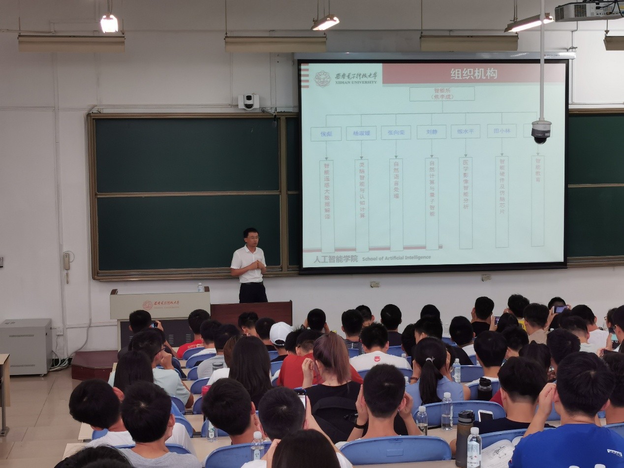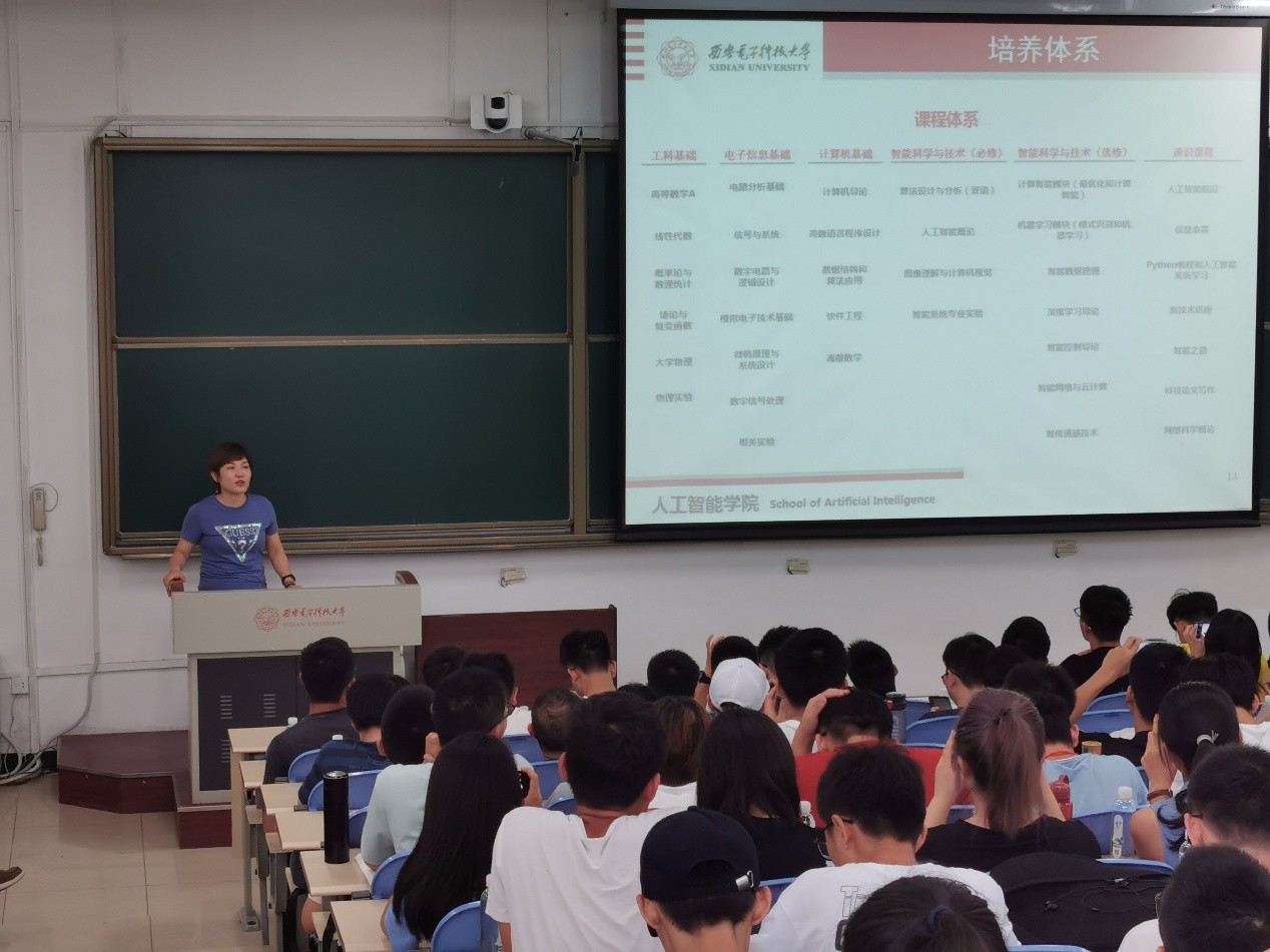 详细介绍了专业的培养方案和课程设置等大家迫切关注的问题。她从专业发展的背景出发,首先介绍了国内外智能专业的发展历程,然后阐述了pp电子在教学和科研实践中创新地确立“国际化+西电特色”的本硕博一体化培养体系。通过介绍,学生们进一步明晰了专业方向,明确了奋斗目标。