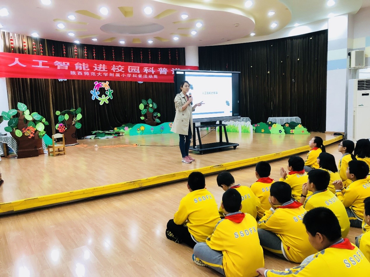 2018年9月18日下午,pp电子白静副教授在陕师大附小长安校区,为小学生进行人工智能进校园科普讲座,做题为“人工智能的故事”的报告;