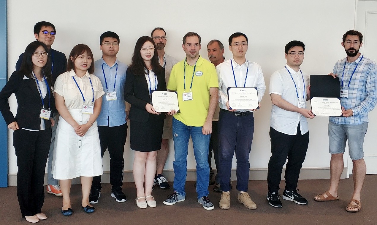 (大会组委会主席Peter Baumann, Bertrand Le Saux, Irene Hajnsek, Naoto Yokoya与团队成员合照,大会主席为获奖团队颁奖)