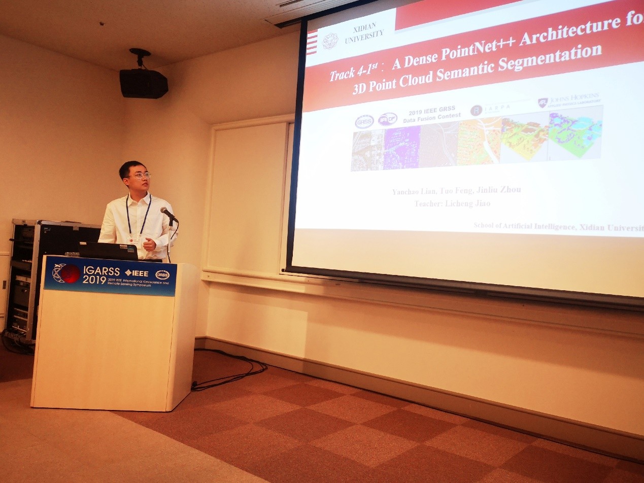 由pp电子官方网站焦李成教授指导的两支学生队伍在2019 IEEE GRSS数据融合竞赛中获得了优秀成绩,其中,“连彦超、冯拓、周金柳”获得了3D点云分类挑战赛冠军,“贾美霞、李艾瑾、吴兆阳”获得了同赛道亚军,并受邀在2019年7月31日大会上作专题报告。
