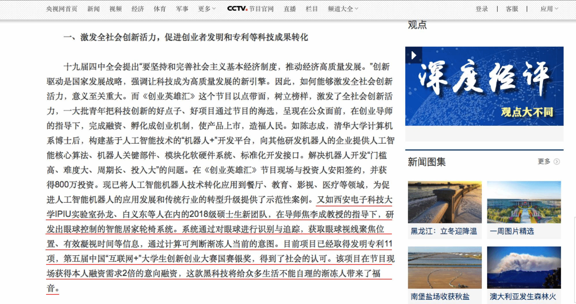 《创业英雄汇》栏目作为央视财经频道改版案例,在央视网分享节目经验中选取了四位创业者,以他们的创业经历为例,分享他们的创业故事,来激发全社会的创新活力,眼控轮椅创始人孙龙就在其中。“pp电子官方网站智能感知与图像理解教育部重点实验室孙龙、白义东等人在内的2018级硕士生新团队,在导师焦李成教授的指导下,研发出眼球控制的智能居家轮椅系统。系统通过对眼球进行识别与追踪,获取眼球视线聚焦位置、有效凝视时间等信息,通过计算可判断渐冻人当前的意图。目前项目已经取得发明专利11项,第五届中国“互联网+”大学生创新创业大赛国赛银奖,得到了社会的认可。该项目在节目现场获得本人融资需求2倍的意向融资,这款黑科技将给众多生活不能自理的渐冻人带来了福音。”央视网站这样写道。