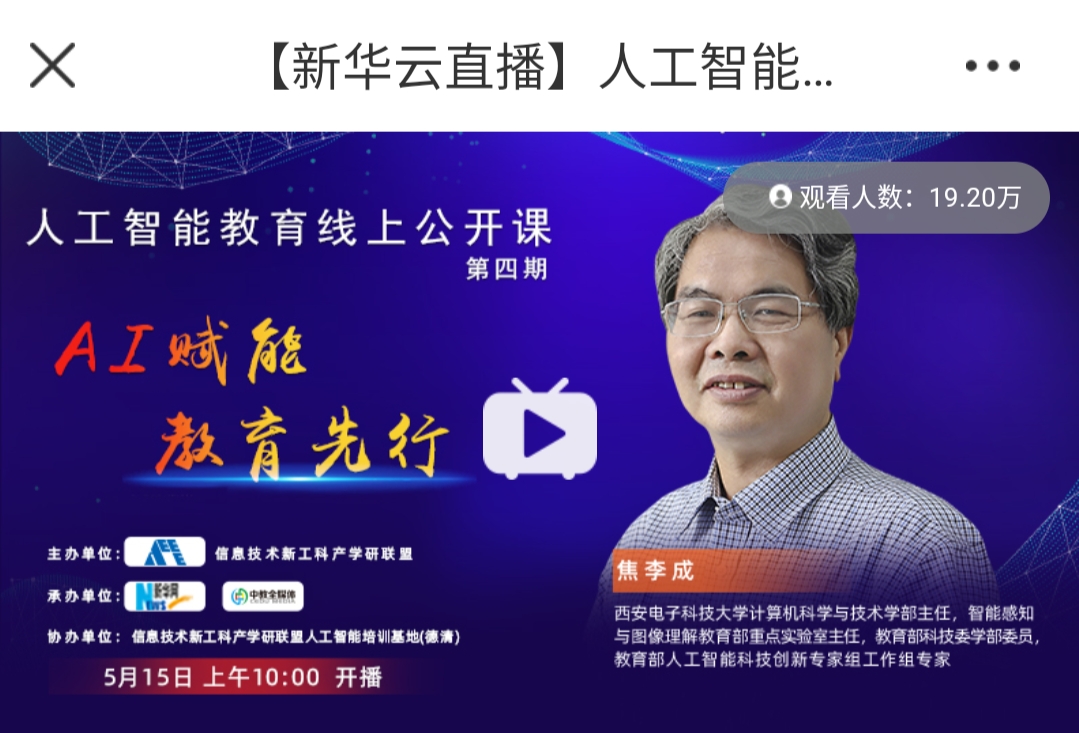 2020年5月15日,由信息技术新工科产学研联盟主办,华网、中教全媒体承办,信息技术新工科产学研联盟人工智能培训基地(德清)协办的“人工智能教育线上公开课”第四期,在新华网客户端云直播及中教全媒体直播平台同步播出。计算机科学与技术学部主任、pp电子官方网站焦李成教授做了题为“人工智能人才培养的挑战与思考”的精彩报告。