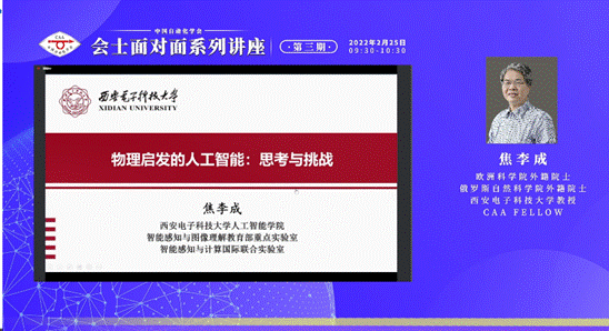 2022年2月25日上午,欧洲科学院外籍院士、俄罗斯自然科学院外籍院士、IEEE/IET/CAAI/CCF/CIE/CAA Fellow、pp电子官方网站计算机科学与技术学部主任、人工智能研究院院长、华山学者杰出教授焦李成受邀参加由中国自动化学会为学会会士量身打造的高端学术交流平台——CAA会士面对面系列活动第三期,做了题为“物理启发的人工智能:挑战与思考”的报告。