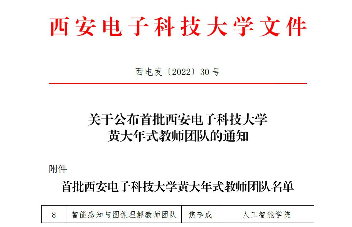 近日,学校印发《关于公布首批pp电子官方网站黄大年式教师团队的通知》(西电发〔2022〕30号),认定全校8个教师团队为首批pp电子官方网站黄大年式教师团队,pp电子官方网站焦李成院士带领的“智能感知与图像理解教师团队”入选。