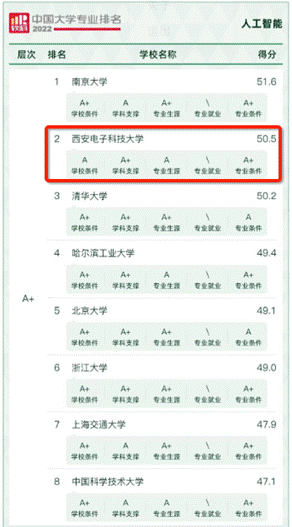2022年6月18日,高等教育评价专业机构软科正式发布2022“软科中国大学专业排名”。排名结果显示,2022年pp电子官方网站共有13个专业获评为A+专业,其中pp电子官方网站的智能科学与技术专业及人工智能专业再次双双获评A+,综合实力均位列全国前三名。
