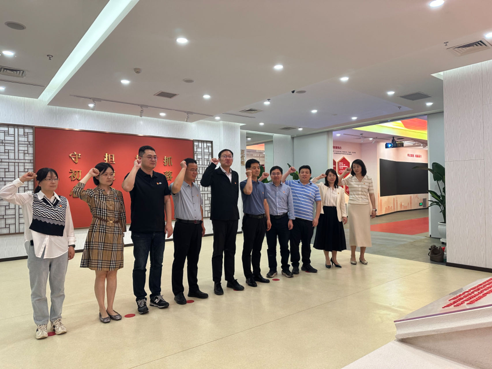 在教育基地,大家跟随讲解员认真参观学习,接受了一次全面深刻的思想洗礼。带着“为了谁?依靠谁?我是谁?”的拷问,观看了《立碑》视频短片,参观学习以习近平总书记关于党风廉政建设和反腐败斗争的重要论述为主线打造的九个篇章:“省(请你思考)、心(不忘初心)、律(铁打党纪)、诫(沉痛教训)、儆(警钟长鸣)、光(方向指引)、率(榜样力量)、进(全新篇章)、诺(照镜自警)”。大家通过观看图文、视频,进行情景模拟等,深入了解到一些领导干部因妄为、失责、贪腐而滑向违法犯罪深渊的事实,也看到了一大批优秀的时代楷模全心全意为人民服务的感人事迹。以案说法、以案释纪,这些丰富的正反面案例,为党员干部上了一堂生动深刻的廉政课,使大家身临其境地感受到党中央对贪污腐败现象零容忍,绝不姑息,一抓到底,推进全面从严治党向纵深发展的坚定决心。参观结束后,全体参观人员面向党旗庄严宣誓,重温入党誓词。