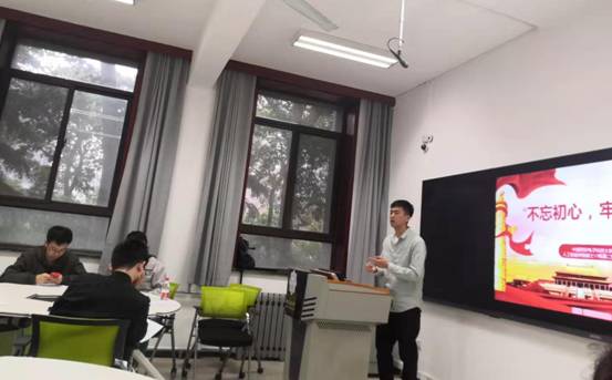 第三部分由支部书记田英轩带领支部党员分享了近期“不忘初心,牢记使命”主题教育系列活动的收获以及支部组织同学观看电影《我和我的祖国》感想。党员王晓真分享了他观看电影中夺冠故事的感悟,彰显出人民对国家荣誉的自豪感和认同感。党员叶伟良观看电影后回忆起了2008年,虽然那一年我们国家经受了很多考验,我们依然成功举办了奥运会,彰显了中华民族的凝聚力,同时也对中华民族伟大复兴充满了必胜的信念。党员王达讲述了他观看电影中相遇故事的感想,是无数前辈的努力奠定了我国国防强国的地位。田英轩分享了学习过程中的感悟,从政治、经济、文化等多个角度论证了中国的道路自信和文化自信。