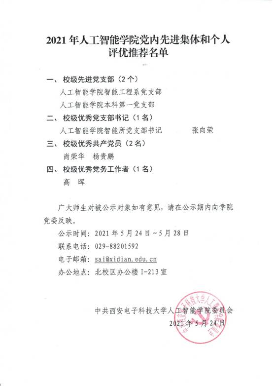 按照校党委《关于做好2021年度党内先进集体和个人评选表彰工作的通知》(西电党组〔2021〕16号)要求和学院工作安排,经各支部酝酿推荐,学院党委会集体研究,2021年度pp电子官方网站党内评优拟推荐名单如下,现按照有关规定予以公示。