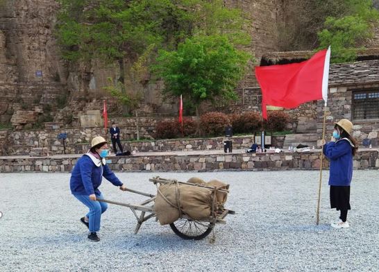 习近平总书记指出:“红旗渠精神是我们党的性质和宗旨的集中体现,历久弥新,永远不会过时。”4月17日中午抵达林州后,学院研学团一行便马不停蹄地前往红旗渠纪念馆参观学习。纪念馆里珍贵的视频和图片资料,让研学团成员对红旗渠精神有了更为深刻的认识,“林县人民多壮志,誓把山河重安排”的豪迈气魄更是让成员们感触颇多。随后,研学团还认真开展了现场体验教学,通过推独轮车、抬太行石、抡开山锤等实践项目,真切体会到建设红旗渠“一锤一钎一双手”迎难而上、战天斗地的精神品格。