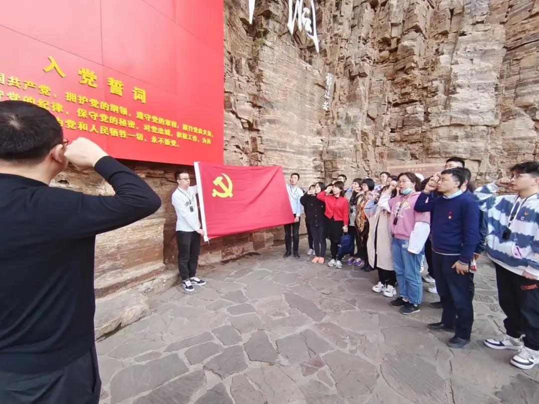 下午,研学团实地参观了红旗渠分水闸和青年洞。抚摸着太行山体上坚硬的岩石,研学团成员更直观的感受到当年林县人民开凿水渠的艰辛与不易,深刻理解周恩来总理所讲的“新中国有两大奇迹,一个是南京长江大桥,一个是林县红旗渠”,更加深刻的理解了红旗渠精神的精髓所在。随后,在青年洞旁,学院党委书记魏峻带领成员们重温了入党誓词。