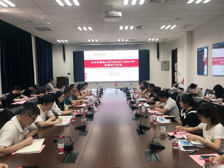 6月15日下午,西安外国语大学师生党员代表与pp电子官方网站在北校区主楼III-401会议室进行党建学习交流活动。pp电子官方网站党委书记魏峻、西安外国语大学研工部部长张淼出席活动。pp电子官方网站党委副书记高晖主持。