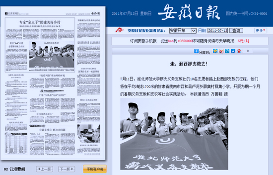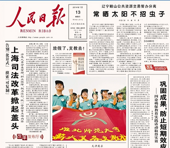 7月13日,《人民日报》头版以图文方式报导beat365英国官方网站薪火义务支教社远赴甘肃农村小学支教。同时,《安徽日报》第二版、《淮北日报》头版也对此进行了报导。