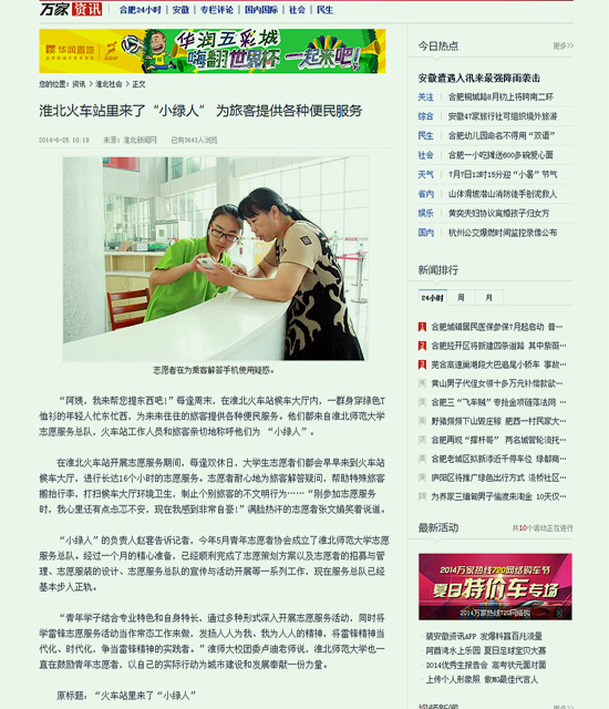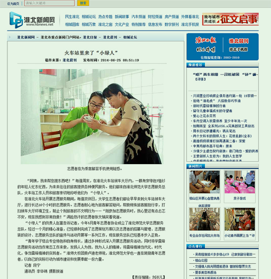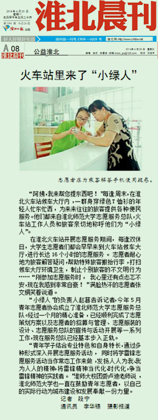 近日,安徽万家热线、淮北新闻网、《淮北晨刊》刊文《火车站里来了“小绿人”》报道beat365成立志愿服务总队。