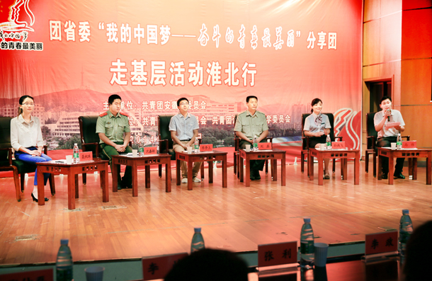 为深入贯彻落实习近平总书记系列重要讲话精神,培养和践行社会主义核心价值观,扎实推进“中国梦”主题教育实践活动,由共青团安徽省委主办的“我的中国梦——奋斗的青春最美丽”分享团走基层活动于6月18日上午在学校文南报告厅举行。校党委副书记、纪委书记朱德顺,共青团安徽省委副书记李国阳,共青团安徽省委宣传部副部长刘存磊、共青团安徽省委少年部副部长李政、共青团淮北市委书记张红君等出席分享会。分享会由校团委书记马伟主持。