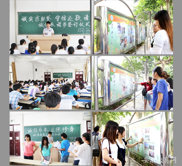 自5月16日以来,学校开展了“诚信为本·立德修身”学生资助诚信教育主题月系列活动。组织近千名生源地信用助学贷款学生参加了“诚实求助贷·守信还款清”——诚信承诺书签订活动;组织四百名国家奖助学金获得者和生源地信用助学贷款学生参加了“诚信为本·立德修身”——诚信教育及征信知识竞赛;开展了“诚信为本·立德修身”诚信征文比赛活动,活动期间,共收到作品286份,经过评委认真评审,共评选出一等奖5名,二等奖10名,三等奖20名;开展了“诚信为人之本”图片展览活动,宣传诚信美德,弘扬诚信精神,进一步引导学生树立诚信意识,强化学生资助工作的育人效果。