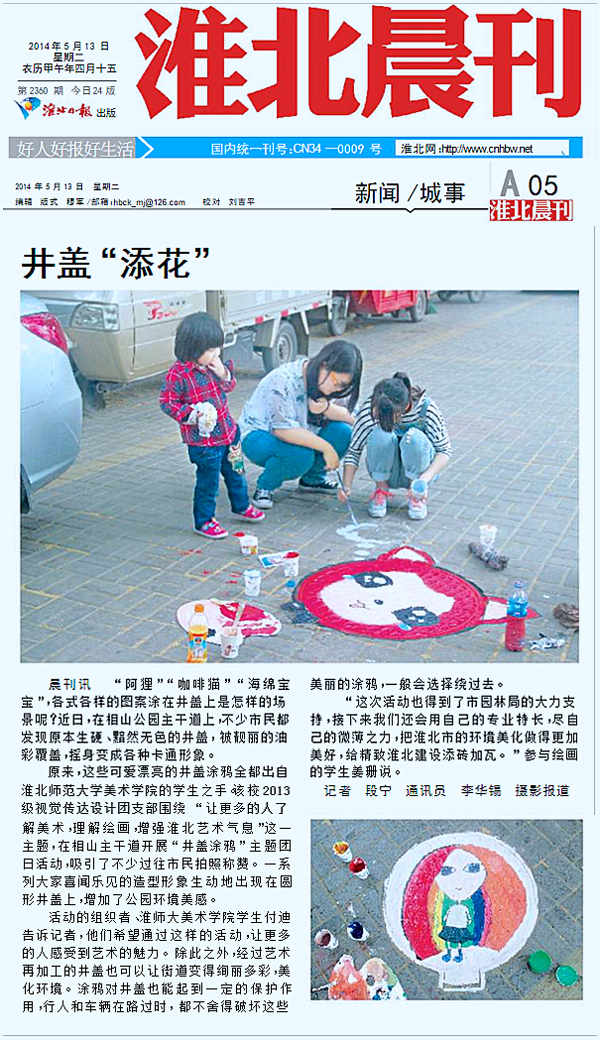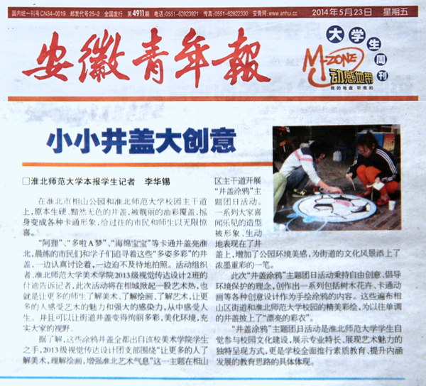 近日,在《安徽青年报》第4911期一版、《淮北晨刊》第2360期A05版报道beat365美术学院2013级视觉传达设计专业“井盖涂鸦”主题团日活动。
