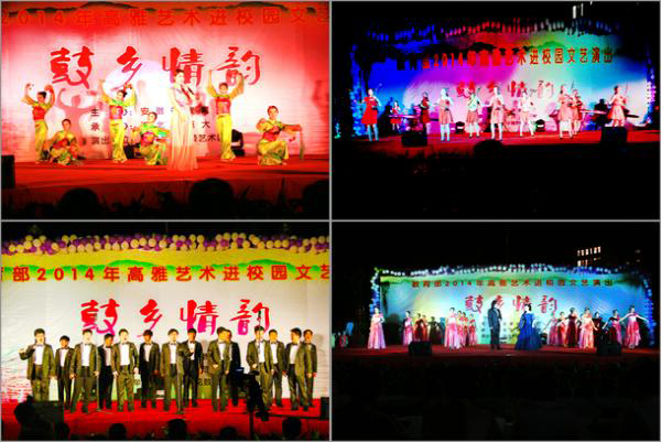 高雅艺术进校园活动旨在弘扬优秀民族文化、提高大学生艺术修养,使广大学子能够感受经典、陶冶情操、提高修养,符合大学生全面发展的需要,对缔造优良校园文化有着举足轻重的作用。此次“鼓乡情韵”文艺演出的成功举办,对弘扬优秀传统文化、丰富学校校园文化生活以及营造向真、向善、向上、向美的文化氛围具有积极的推动作用;广大师生零距离地直接感受到了内容和形式丰富的高雅艺术带来的魅力及其强大精神力量,提高了师生的艺术素养,陶冶了情操,营造了高雅和谐的校园文化氛围。