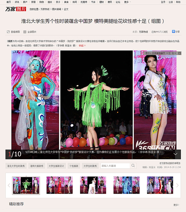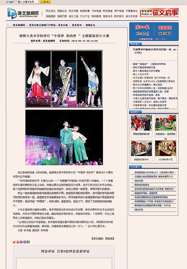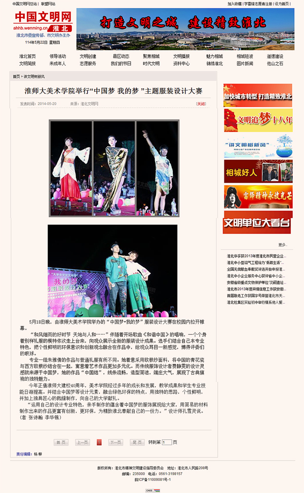 近日,中国文明网、安徽“万家热线”、淮北电视台、淮北新闻网等媒体相继报道美术学院服装设计大赛。