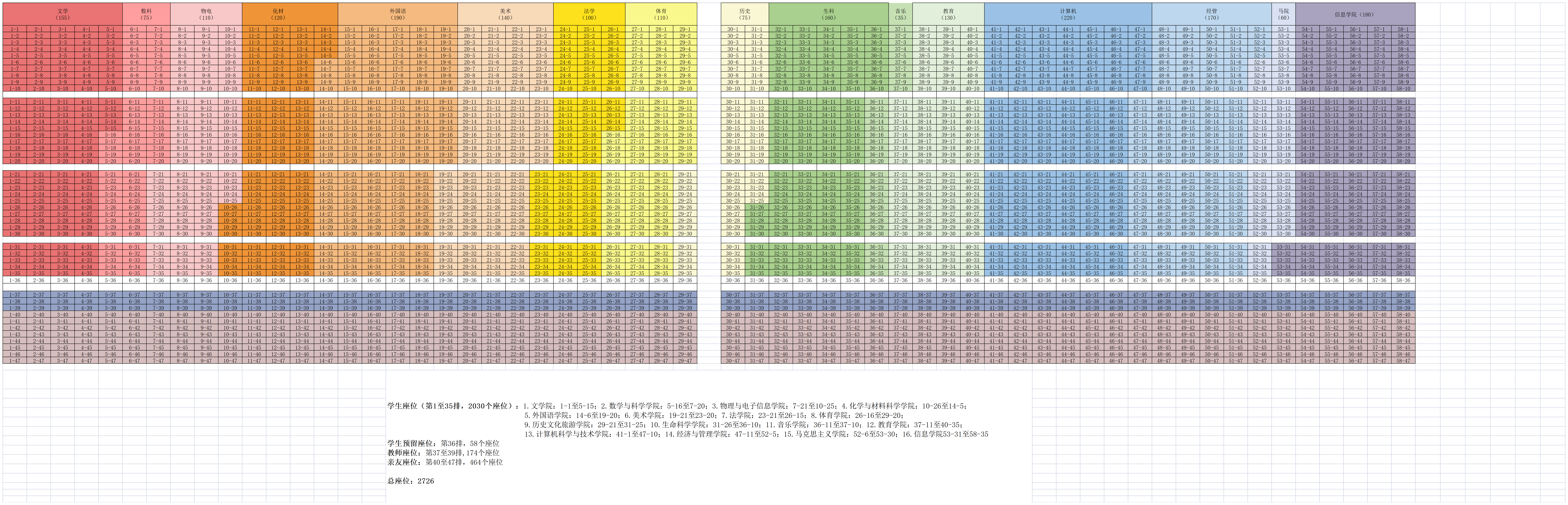 3.请参加人员认真查看会场座位分布图(见附件2)在指定位置就坐。请各学院提前按照分布区域安排学生座位,并组织好本学院学生进场后按指定位置就坐。