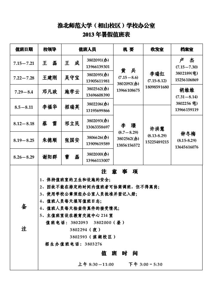 beat365英国官方网站(相山校区)学校办公室2013年暑假值班表