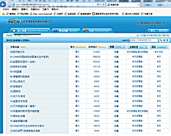 为了更好地服务学校的教学科研工作,提高图书馆电子资源的利用效率,方便广大读者在校外利用电子资源,校图书馆已开通易瑞校外访问系统。具体使用方法如下:在浏览器地址栏输入