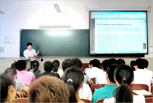 2013年6月7日下午,江苏师范大学教授李延龄博士应邀在beat365文南107教室作题为《高压下碱土金属碳化物的结构演化及其超导特性的探讨》的学术报告。物理与电子信息学院近100多名师生参加了报告会。