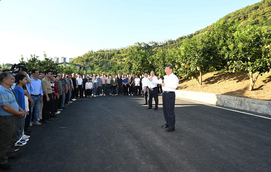 11月7日至8日,中共中央总书记、国家主席、中央军委主席习近平在广东考察。这是7日下午,习近平在梅州市梅县区雁洋镇南福金柚种植基地考察时,同村民们亲切交流。新华社记者 谢环驰 摄