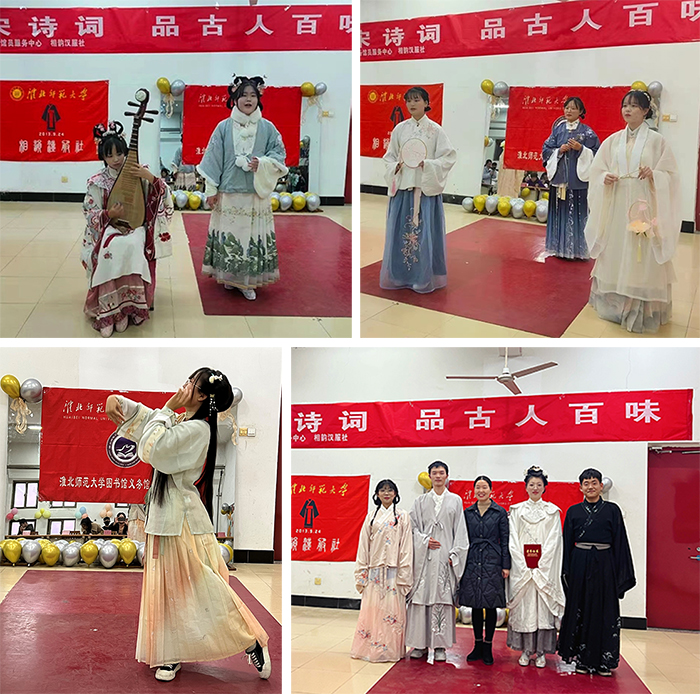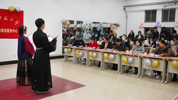 11月27日,校图书馆义务馆员服务中心联合相韵汉服社在相山校区图书馆北七楼举办了主题为“鉴唐宋诗词,品古人百味”的诗词吟诵比赛。图书馆馆长赵慧芳等担任评委。