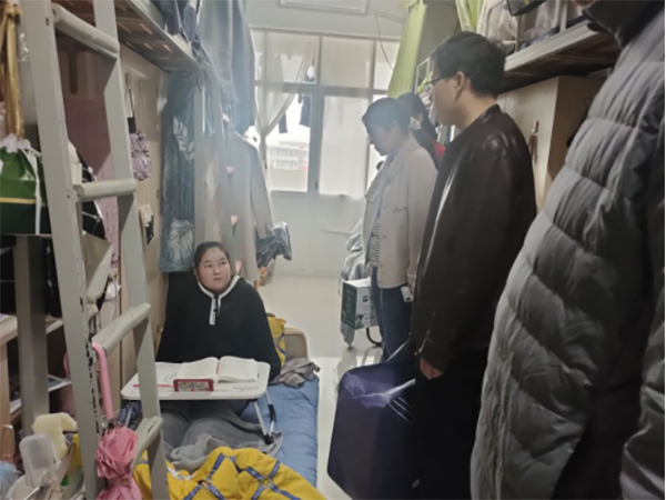 11月29日下午,马克思主义学院党总支负责人、辅导员等一行4人来到学生寝室,慰问意外受伤学生热沙来提·买买提,并送上棉被、牛奶等慰问品。