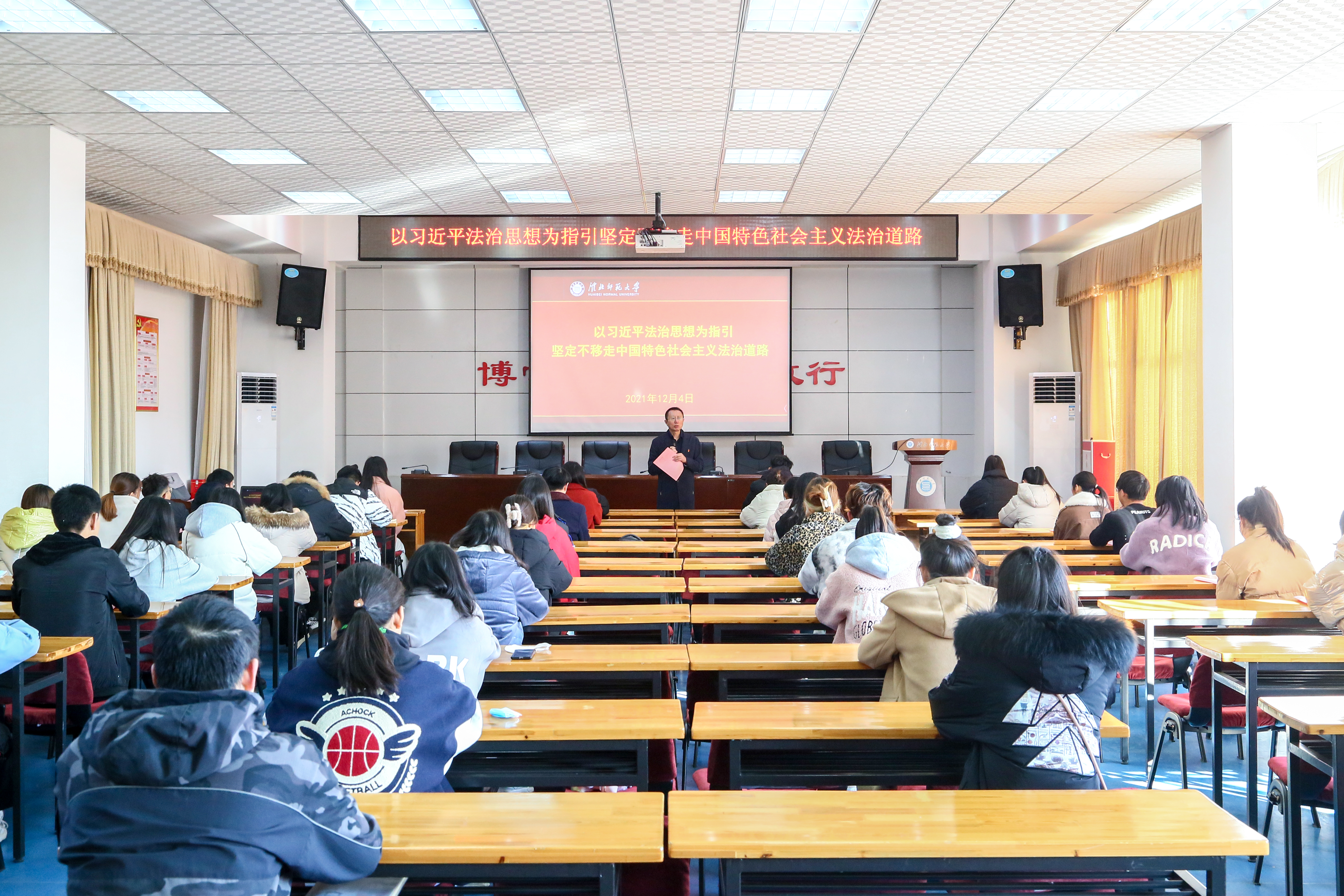 2021年12月4日是第八个国家宪法日。为增强学生法制观念,突出国家宪法日的重要性,引导大家知宪法、懂宪法,坚持宪法在中国特色社会主义法律体系中的核心地位,维护宪法权威。beat365英国官方网站以相山校区行办公楼第三会议室为主会场组织师生开展“宪法晨读”活动。本次活动由党委宣传部、校团委、郝文清名师工作室联合举办,活动由马克思主义学院郝文清教授主持。