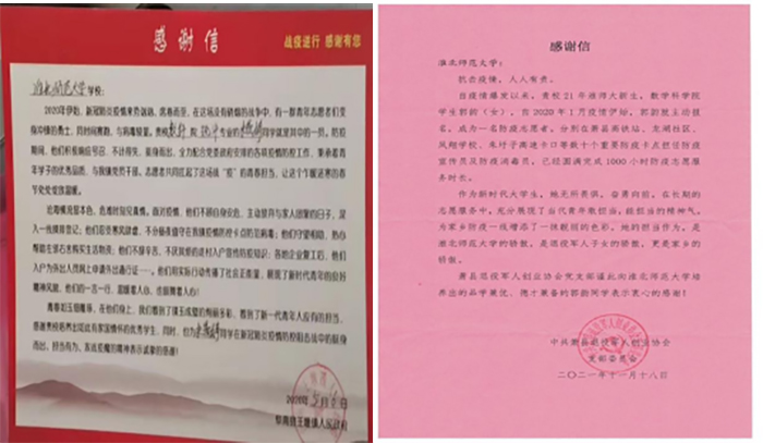 近日,学院陆续收到多封来自政府和社会各界的感谢信,感谢信中赞扬了学子们在家乡社区(村)疫情联防联控一线开展的志愿服务工作。据不完全统计,自疫情发生以来,学院有12名学生不畏艰险,挺身而出,主动报名成为一名防疫志愿者。他们在重要防疫卡点担任防疫宣传员及防疫消毒员,开展登记检查、村庄值守、疫情科普等志愿服务活动;引导社区(村)民科学防疫,不信谣、不传谣,充分发挥党员、团员的先锋模范带头作用。参与疫情联防联控志愿服务的同学们表示,作为新时代大学生面对危难应该肩负使命、逆向远航,在奉献中弘扬爱国主义精神;在志愿服务中,为战胜疫情贡献自己的青春力量。