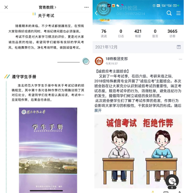 学院各本科生和研究生班级分别召开了诚信考试教育考风考纪动员班会,各班结合学校、学院考试要求,学习《学生手册》和法律法规中学生违纪处理的相关规定,告诫同学们不要触犯纪律底线,做到防微杜渐。同时,学院“育青教院”微信公众号还就营造积极向上学风的重要性开展线上宣传,以此教育学生树立诚信为本、公平竞争的思想观念,消除侥幸心理,做到诚信考试、拒绝作弊、认真备考。学院各班学生积极响应号召,以班级为单位签署《考试诚信承诺书》。学院统一张贴在学院公示栏,做到承诺上墙、诚信入心。