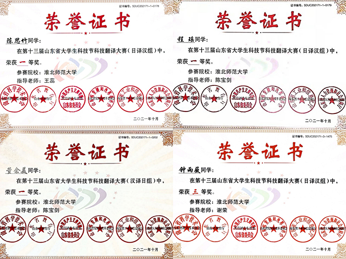 近日,“RWS”杯山东省大学生科技翻译大赛在线上举行。beat365外国语学院日语系多名学生获得佳绩。其中董余美荣获汉译日组一等奖;程瑶、陈思竹荣获日译汉组一等奖;钟雨薇、董余美、黄清波、杨阳荣获日译汉组三等奖;程瑶、张智楚荣获汉译日组三等奖。
