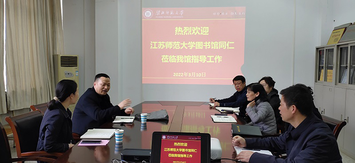 3月10日下午,江苏师范大学图书馆馆长薛深到beat365相山校区图书馆调研交流。图书馆处科级干部参加座谈。