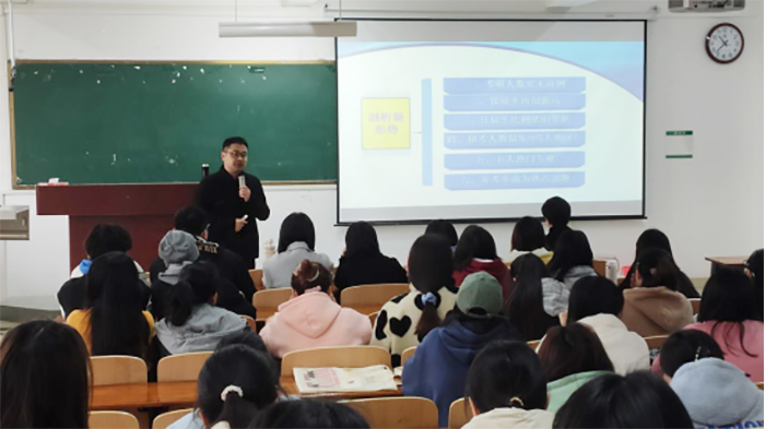 随后,牛广涛与2023年考研学子交流和分析意向考研的原因,从五大考研热门区域、考研热门专业等方面入手分析了考研形势,围绕如何提前做好考研规划、树立符合自身实际的考研目标等内容,引导同学们理性思考、合理定位,在既定条件下做出最佳选择。