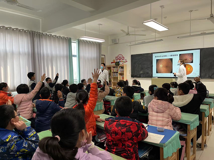 医生们通过生动形象的图片,富有亲和力的语言,从“眼睛的结构、眼睛成像原理、近视的形成和日常预防措施”等方面进行了详细地讲解。学生们认真聆听,积极参与互动活动,在轻松活跃的气氛中了解了护眼知识,明白了预防近视的重要意义。