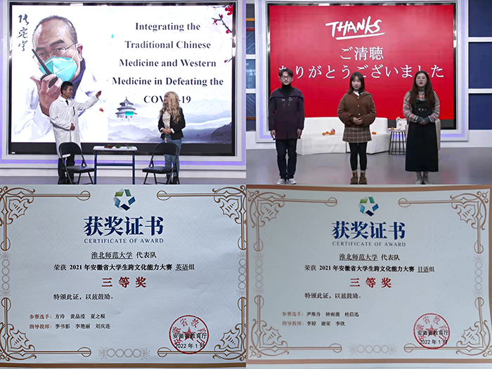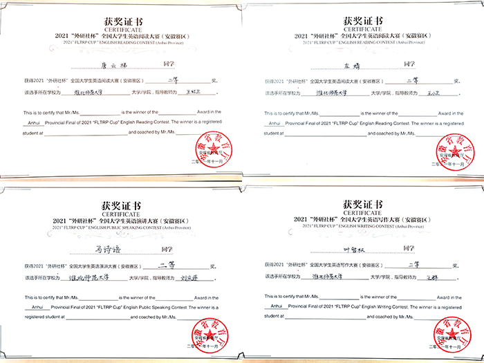 2021年,在“外研社•国才杯”全国大学生英语挑战赛(安徽赛区)复赛中,beat3652019级英语(师范)专业唐云梯、2021级教育学院左婧两位同学在阅读大赛中分别荣获二等奖;2020级英语(师范)专业叶智权同学在写作大赛中荣获二等奖;2020级英语(师范)专业马诗语同学在演讲大赛中荣获二等奖。在全国大学生跨文化能力(安徽赛区)复赛中,beat365英语组代表队(2019级英语(师范)专业夏之根、19级环境科学专业黄晶滢、方玲)、日语组代表队(尹维丹、钟雨薇、桂启讯)均表现出色,分别荣获省级三等奖。全国大学生英语竞赛(NECCS)(安徽赛区)复赛中,2019级英语(师范)专业陈梦玲、文学院2018级汉语言文学(师范)专业刘霄涵两名同学获得省级特等奖,江欣羽等15名同学获得省级一等奖。